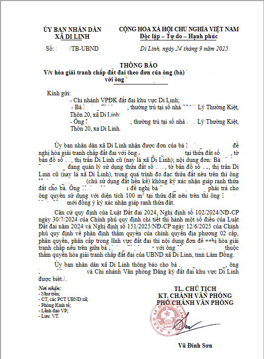 Cơ quan giải quyết: Chủ tịch UBND xã Di Linh