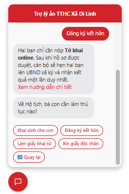 Chỉ trong vài giây, Trợ lý ảo sẽ đưa ra hướng dẫn cụ thể, rõ ràng về thành phần hồ sơ, nơi tiếp nhận, lệ phí, thời hạn giải quyết và đường dẫn tra cứu chi tiết.